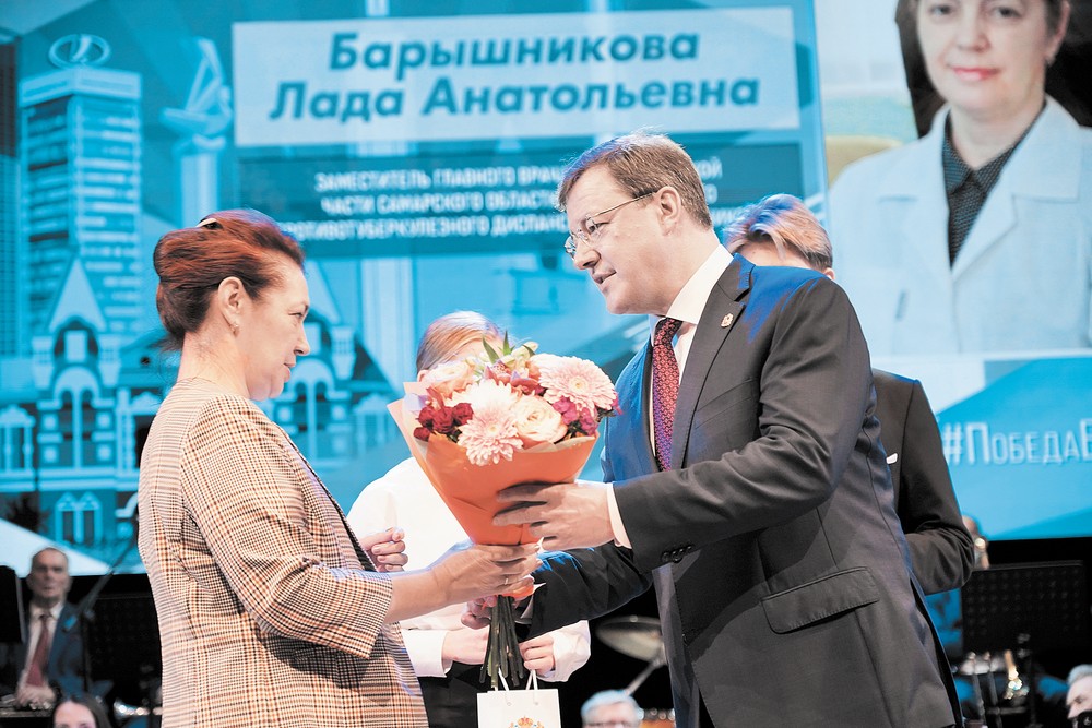 На встрече в филармонии губернатор наградил заслуженных работников отрасли. Почетное звание «Заслуженный врач Российской Федерации» присвоили заведующему нейрохирургическим отделением областной больницы имени Середавина Геннадию Алексееву, заместителю главного врача по медицинской части областного клинического противотуберкулезного диспансера имени Постникова Ладе Барышниковой. Медаль ордена «За заслуги перед Отечеством» II степени вручили профессору кафедры фундаментальной и клинической биохимии с лабораторной диагностикой СамГМУ Фриде Гильмияровой, а Почетный знак Нестора Постникова — врачу-оториноларингологу областного клинического противотуберкулезного диспансера имени Постникова Петру Гурскому.