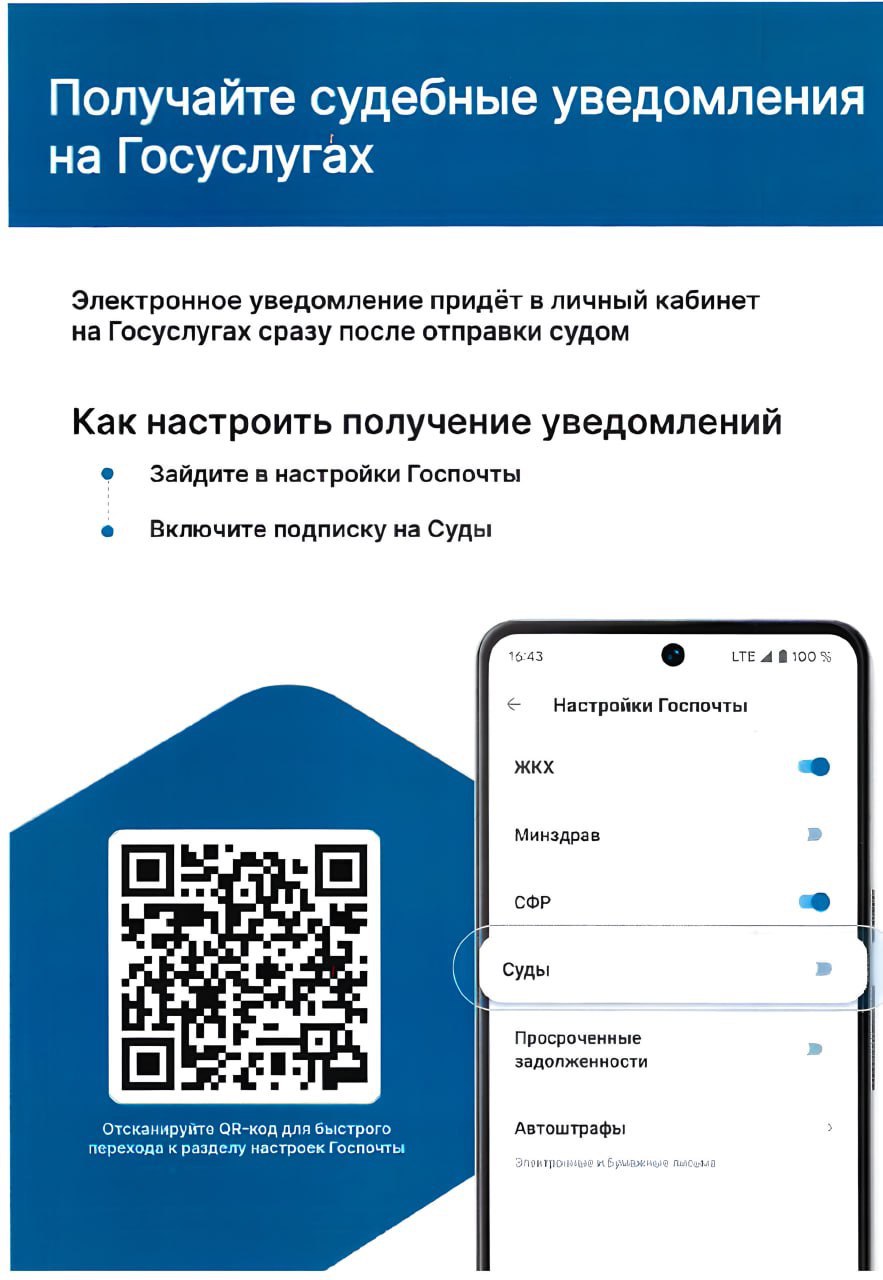 Для получения электронных судебных извещений необходимо в личном кабинете в своем профиле во вкладке «Настройки госпочты» активировать пункт «Суды» (бегунок должен быть синего цвета). Отсканируйте QR-код, размещенный снизу для быстрого перехода к разделу настроек Госпочты.