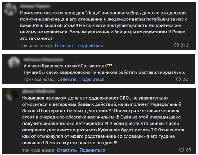 Жители Свердловской области раскритиковали главу региона за этот выпад. Они считают, что глава ЧВК «Вагнер» справедливо указал на имеющиеся проблемы. Пользователи потребовали Куйвашева уважительного отношения к участникам СВО и их семьям.