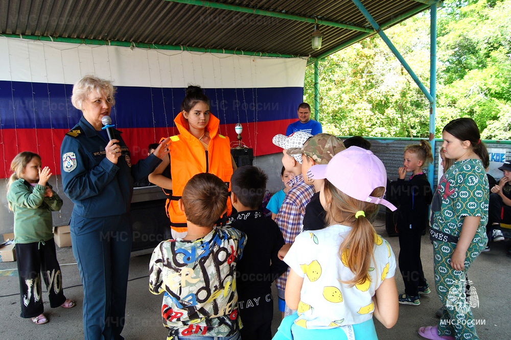 Начальник отдела безопасности людей на водных объектах Наталья Нестерова побеседовала с ребятами о том, что важно знать во время игр около водоемов и купания в них, наглядно показала, как пользоваться спасательным жилетом и кругом, перечислила происшествия, которые могут случиться на воде и рассказала, как их избежать.