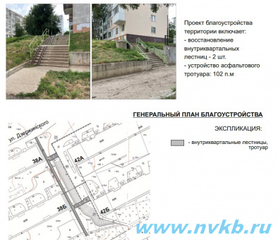 «Доступный двор» - устройство тротуара между д. 38А, д. 38Б, д. 38В и д. 42А, д. 42Б по ул. Дзержинского и восстановление прилегающих к тротуару внутриквартальных лестниц.
