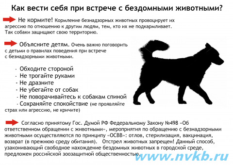 Несмотря на то, что немотивированная агрессия бывает только у больных собак, человеку довольно сложно определить, что он делает не «по собачьим правилам» и чем вызвано агрессивное поведение стаи или отдельной особи, поэтому ниже представлена памятка о поведении при встрече с бездомным животным.