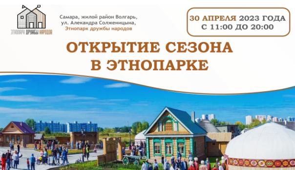 30 апреля 2023 года с 11:00 до 20:00 на территории Этнопарка дружбы народов, находящемся на улице Александра Солженицына в Куйбышевском внутригородском районе Самары, пройдет мероприятие, посвященное открытию весенне-летнего сезона – 2023.