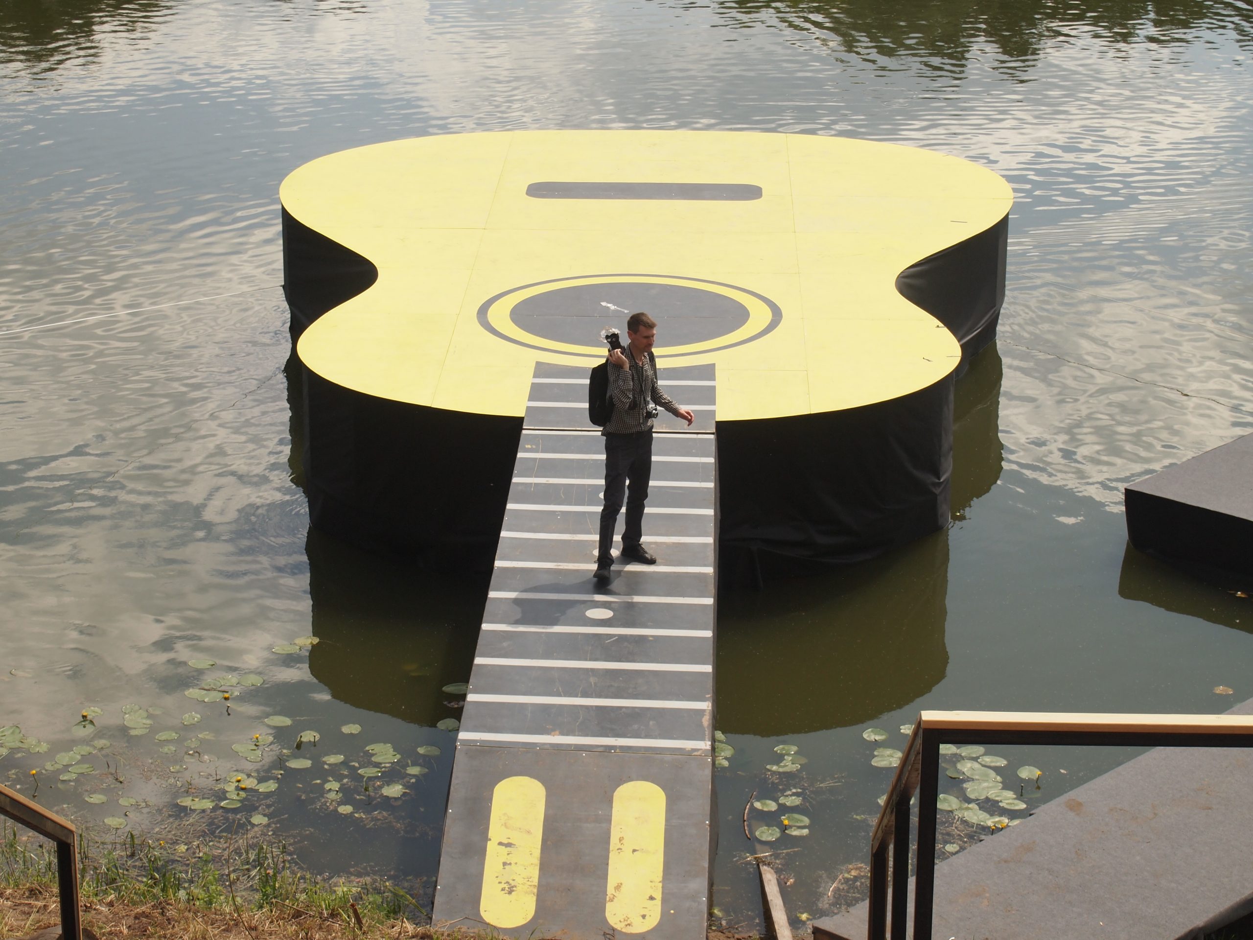 Обновилась и знаменитая, легендарная сцена-гитара, на которой выступают участники главного фестивального концерта. Прежняя два дня назад еще лежала бочком на Поляне, на другом берегу. Вполне возможно, сегодня ее уже не будет. Уйдет в историю.