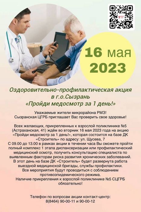 Профилактическое мероприятие состоится на базе ДК "Строитель" 16 мая 2023 года с 9.00 до 13.00. Подробности в объявлении.