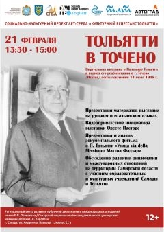 Событие состоится в рамках проекта СГБА «Арт-среда «Культурный ренессанс Тольятти», при поддержке Министерства экономического развития и инвестиций Самарской области и администрации городского округа Тольятти. В программе мероприятия: видеоприветствие от инициатора выставки, экс-мэра города Ре (Италия) Оресте Пасторе ; презентация документального фильма Маттиа Фадзари о Пальмиро Тольятти в период его реабилитации «Улица via della Missione»; обсуждение вопроса развития дипломатии и международных отношений на территории Самарской области с участием образовательных и культурных учреждений Самары и Тольятти. Автор: Редакция TLTgorod