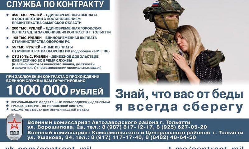 При заключении контракта мужчинам в возрасте от 18 до 60 лет гарантирована выплата в размере 1 млн. рублей. Во время пребывания в зоне СВО военнослужащим ежемесячно выплачивается денежное довольствие в размере от 210 000 рублей. Членам семей предоставляются социальные льготы, гарантии и региональные меры поддержки.
