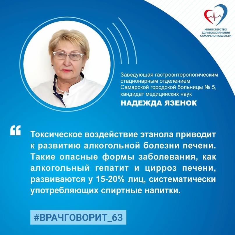 Заведующая гастроэнтерологическим стационарным отделением Самарской городской больницы № 5, кандидат медицинских наук Надежда Язенок: "Токсическое воздействие этанола приводит к развитию алкогольной болезни печени. Такие опасные формы заболевания, как алкогольный гепатит и цирроз печени, развиваются у 15-20% лиц, систематически употребляющих спиртные напитки".