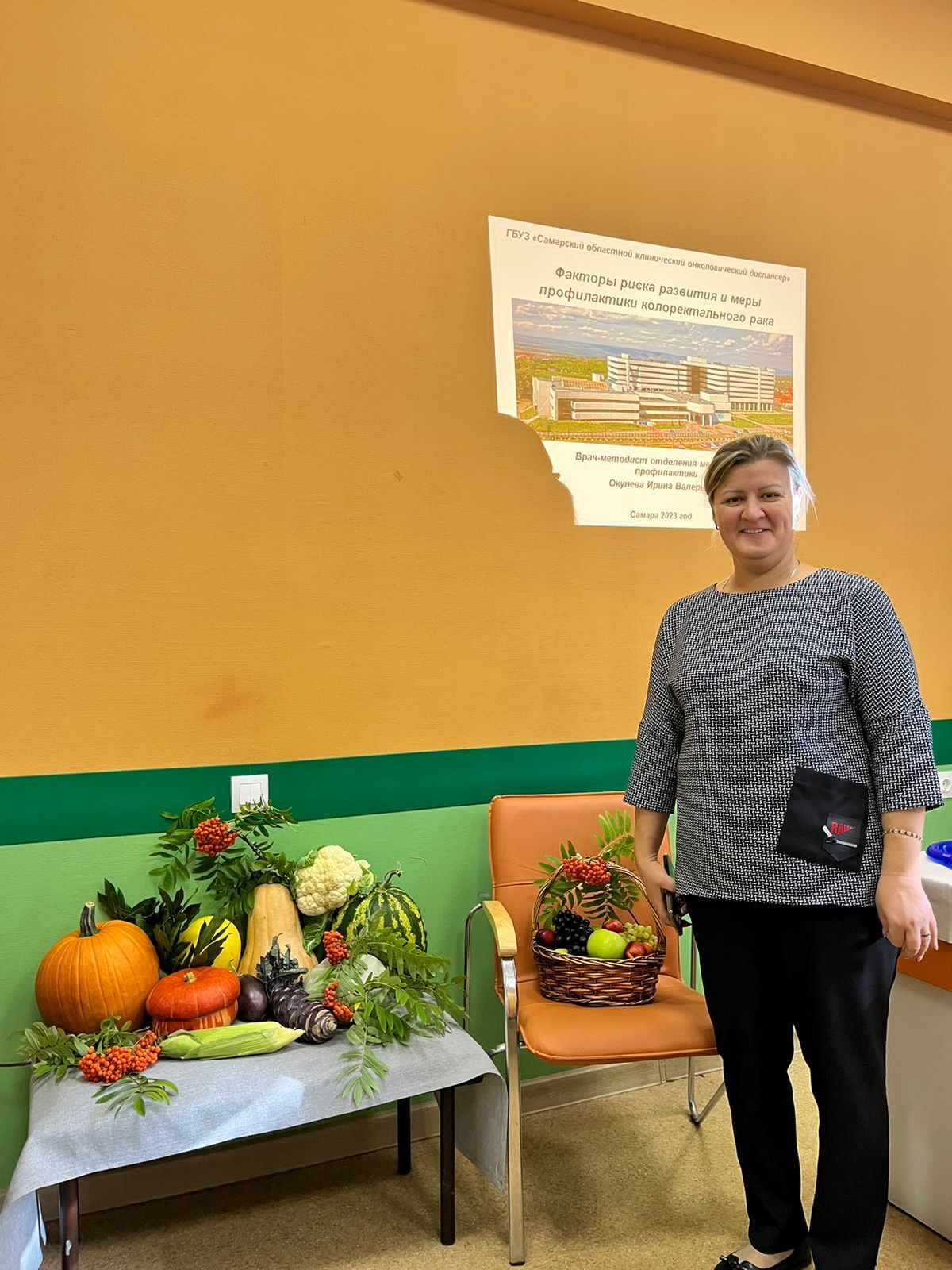 На базе поликлинического отделения №3 расположенного по адресу: г. Самара, ул. Гагарина, 24 состоялось мероприятие «Урожай здоровья», где врачом-методистом ГБУЗ СОКОД Окуневой Ириной Валерьевной была прочитана лекция на тему «Факторы риска развития и меры профилактики колоректального рака». Все желающие получили красочные буклеты. В данном мероприятии приняли участии более 60 человек.