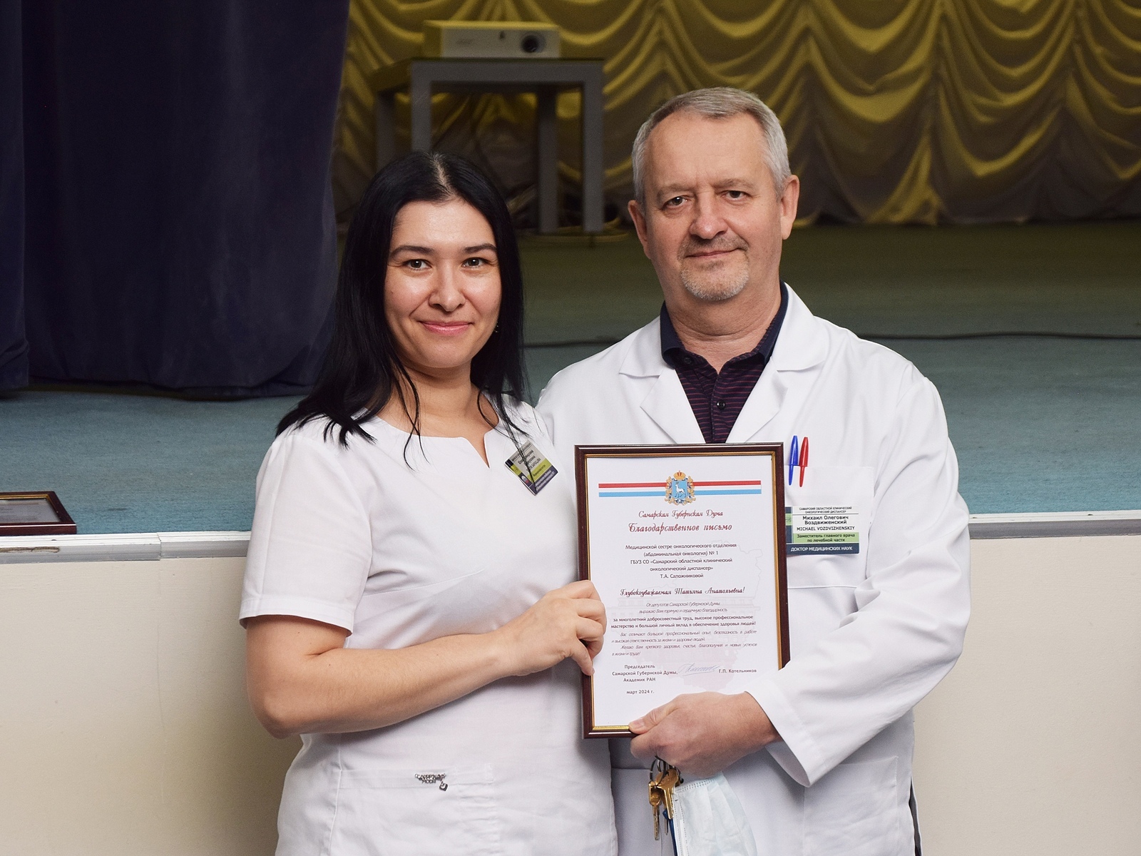 04 марта в Самарском областном клиническом онкологическом диспансере состоялось торжественное награждение сотрудников. Заместитель главного врача по лечебной работе, д.м.н. - Михаил Олегович Воздвиженский вручил почетные грамоты персоналу учреждения.