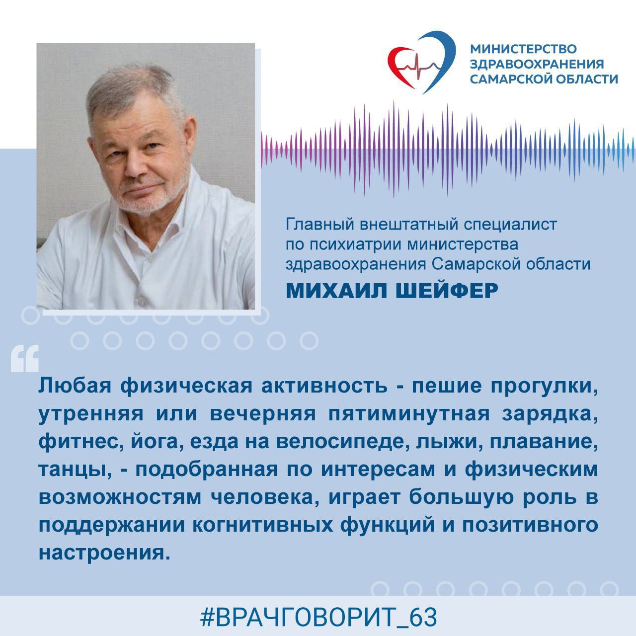 О значимости физической активности для людей старшего возраста рассказывает главный внештатный специалист по психиатрии министерства здравоохранения Самарской области, кандидат медицинских наук, Михаил Шейфер: